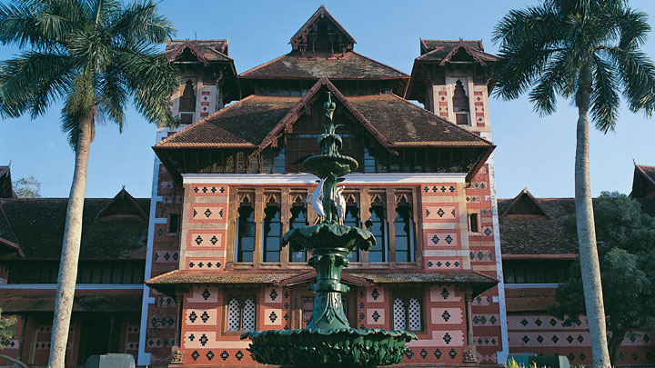 Located in Thiruvananthapuram, Kerala, India, the Kanakakkunnu Palace is a historic palace renowned for its distinctive fusion of Gothic and Keralan architecture. Originally constructed during the Travancore era as a guest house, it is currently a cultural center that holds a number of festivals and events. Perched atop a hill, the palace boasts a circular hall with crystal chandeliers, a neoclassical entrance portico, and vast gardens, including India's first digital garden.